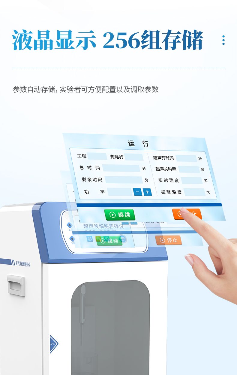 自研自產的超聲波細胞破碎儀功能齊全、外觀新穎、性能可靠,儀器采用大屏液晶顯示;中央微機集中控制,超聲輸出、間隙時間、超聲功率,樣品溫度監測顯示,頻率自動跟蹤,故障自動報警等功能。適用于生物化學、微生物學、藥物化學、表面化學、物理學、動物學、農學、醫學、制藥等領域的教學、科研及生產。