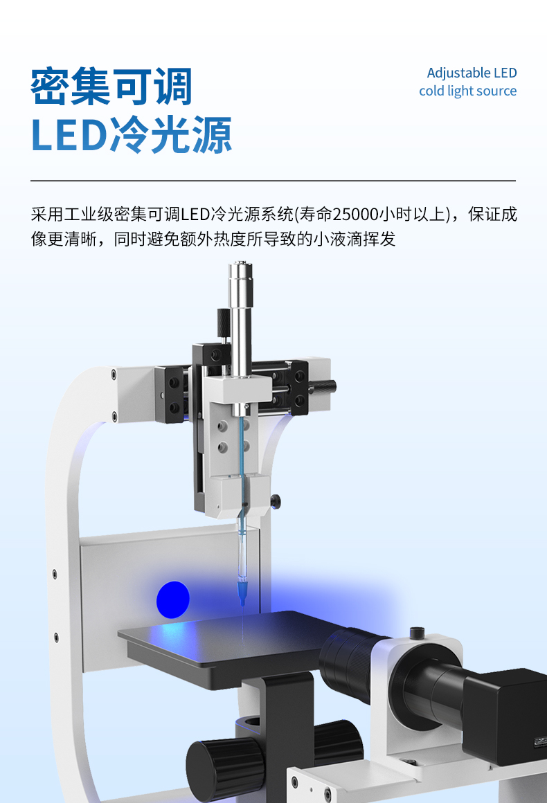 2. 采用工業(yè)級(jí)密集可調(diào)LED冷光源系統(tǒng)(壽命25000H以上),保證成像更清晰,同時(shí)避免額外熱度所導(dǎo)致的小液滴揮發(fā);