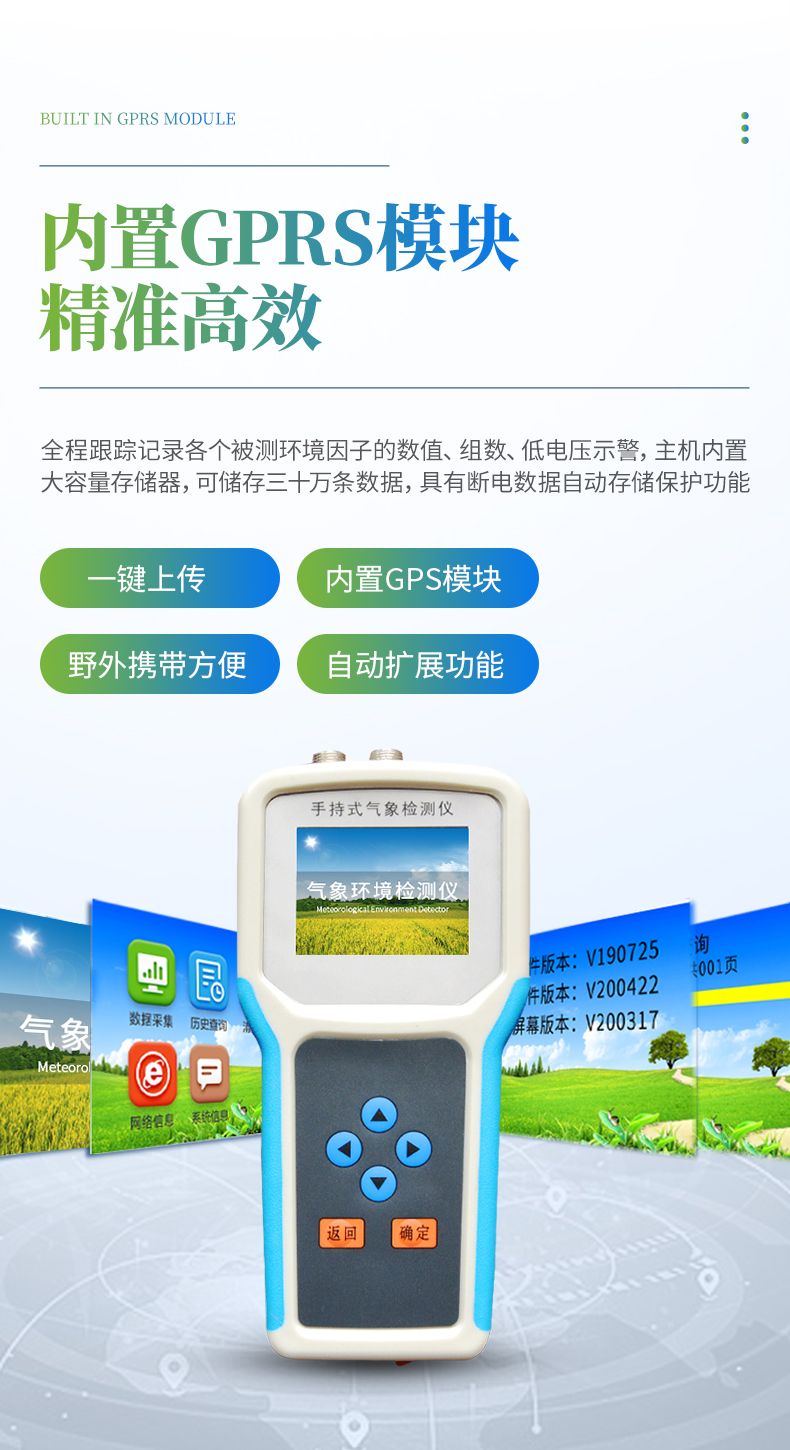 采用一體化結構設計,內置GPS模塊,4G模塊,外置SD卡,能準確的測量出被測地點的地理信息,界面除顯示所測環境參數、存儲數據外,還可顯示測點的經緯度。通過內置的GPRS一鍵上傳被測點的環境因子測量數據等。同時還可以通過外置SD卡直接把數據導出到電腦上。(可選)