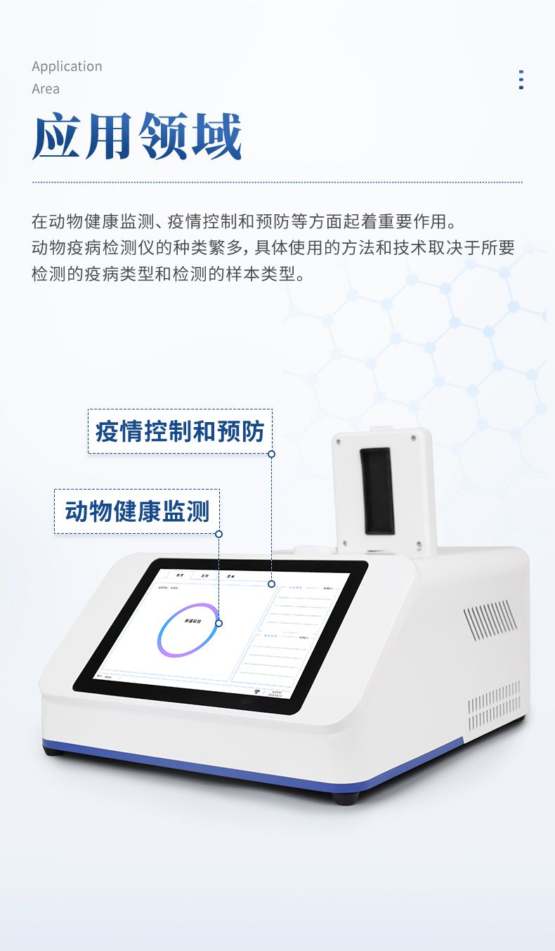 動物/寵物疫病檢測儀是一種用于檢測動物身體樣本中是否存在病原體或疫病的設備。它在動物健康監測、疫情控制和預防等方面起著重要作用。動物疫病檢測儀的種類繁多,具體使用的方法和技術取決于所要檢測的疫病類型和檢測的樣本類型。