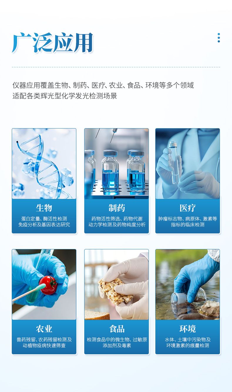 儀器應用覆蓋生物、制藥、醫療、農業、食品、環境等多個領域,適配各類輝光型化學發光檢測場景。