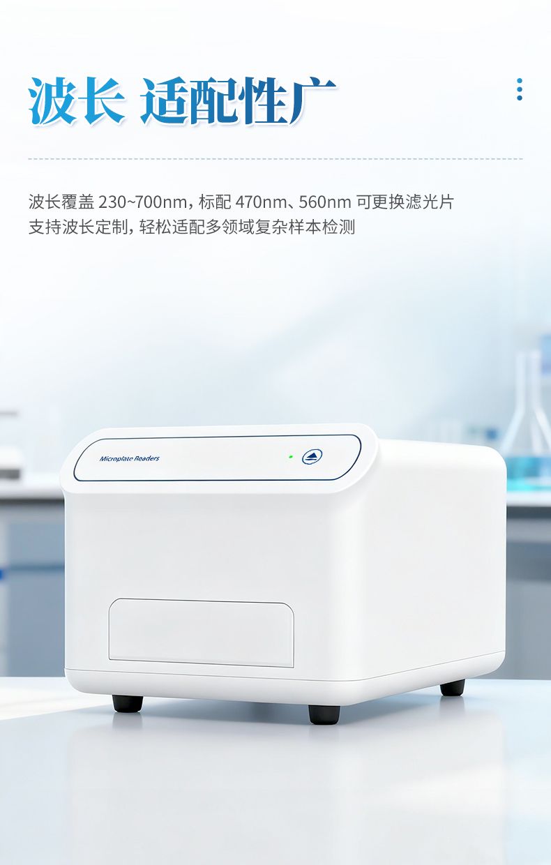 2*.波長覆蓋230-700nm,標配470nm與560nm濾光片更換模塊,用戶可根據需求自行更換,支持波長定制,適配多場景復雜樣本檢測需求;