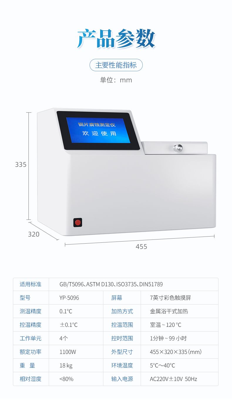 YP-5096石油產(chǎn)品銅片腐蝕試驗(yàn)器采用先進(jìn)的32位MCU,7英寸大屏幕液晶顯示,具有測溫精度高、升溫迅速、穩(wěn)定可靠、操作簡便、易于維護(hù)的優(yōu)點(diǎn)。本機(jī)適用于變壓器廠、供電部門、煉油廠、鐵路、航運(yùn)、貯油站及商業(yè)部門對石油產(chǎn)品腐蝕性質(zhì)進(jìn)行監(jiān)測和控制,進(jìn)行快速分析的必要儀器。測量結(jié)果符合GB/T5096方法規(guī)范。