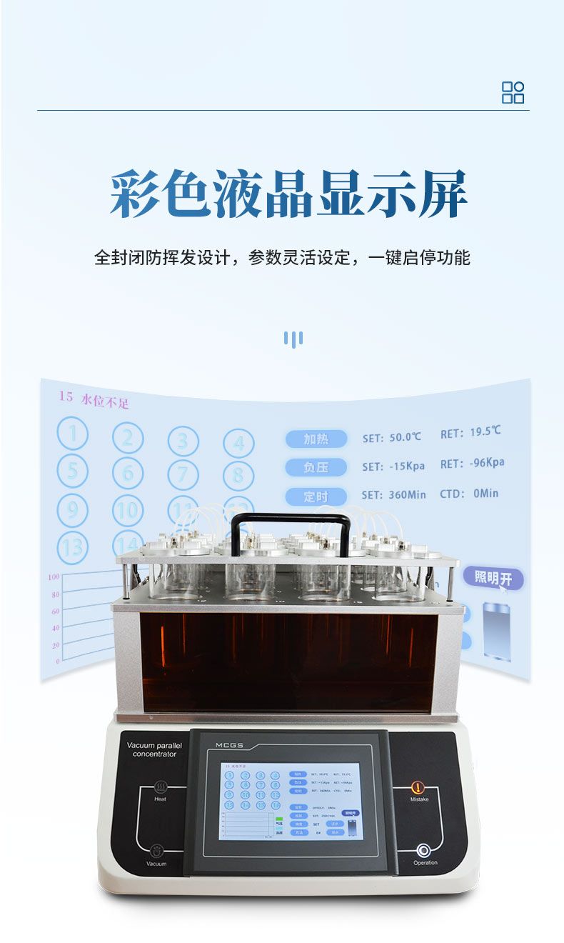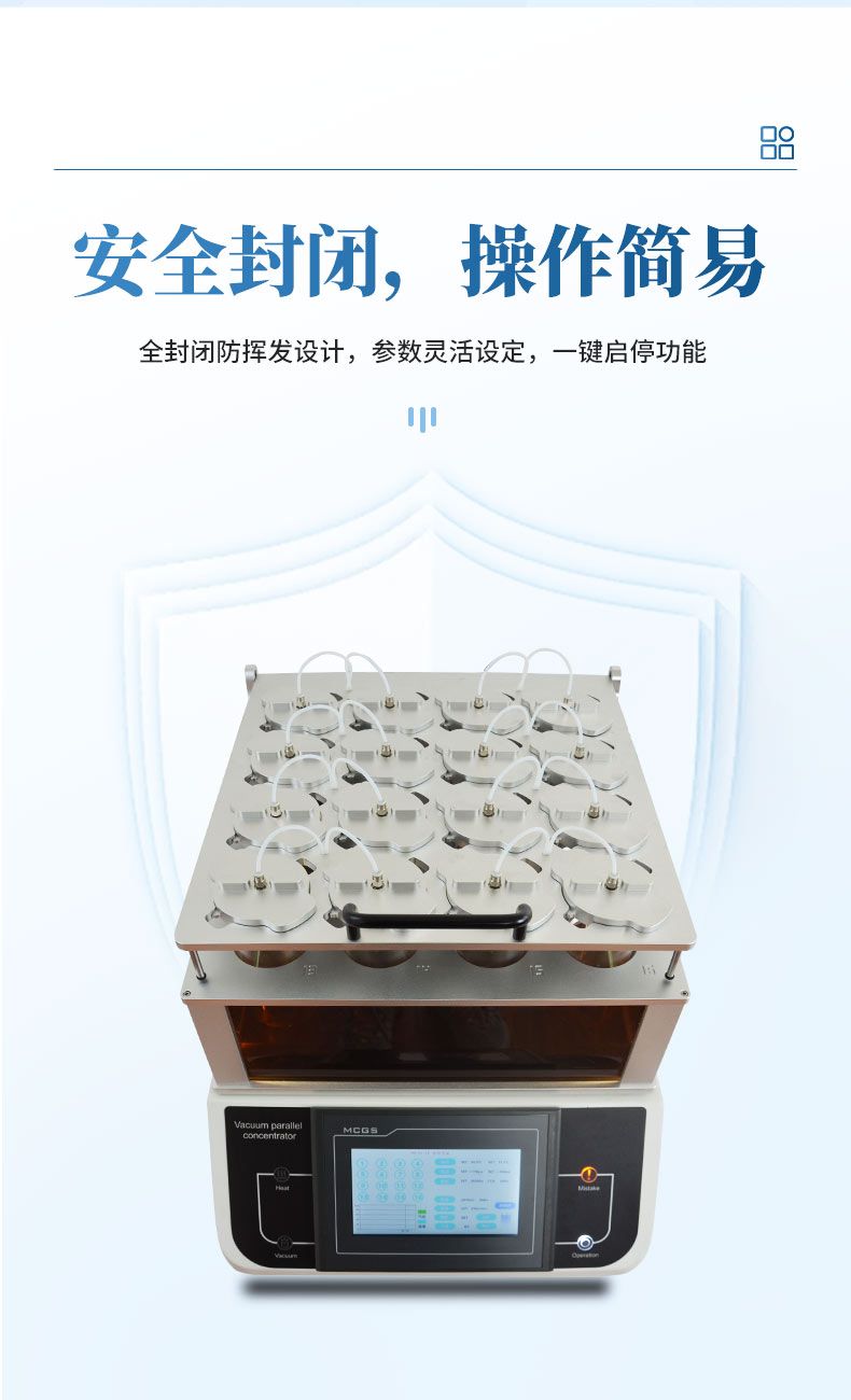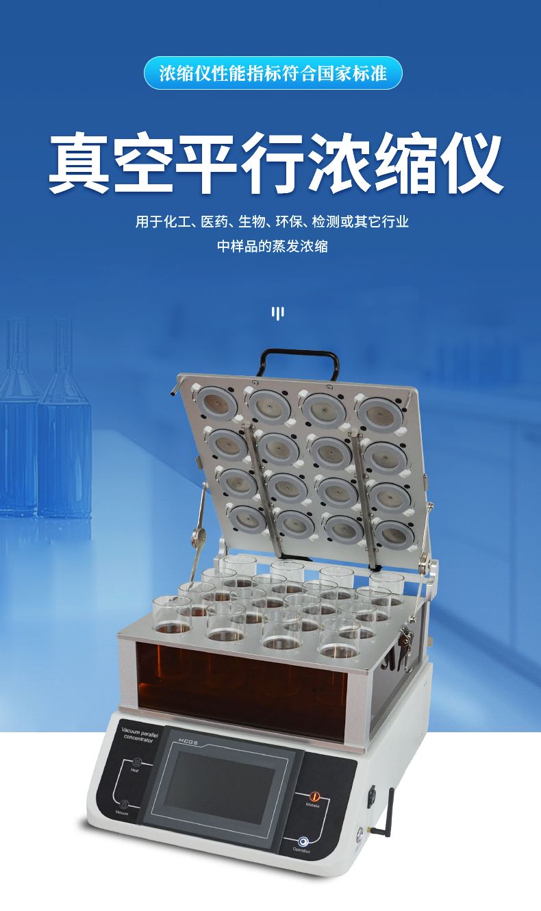 真空平行濃縮儀可對多個樣品進行單獨或者集中密閉蒸發(fā)/濃縮,快速有效的回收溶劑,降低了多個樣品的總蒸發(fā)時間,增加了處理量,節(jié)省了操作實驗時間和實驗資源,平行蒸發(fā)儀安裝操作簡單、使用靈活。由于處理條件高度一致,因此平行性也更好。平行蒸發(fā)儀主要用于化工、醫(yī)藥、生物、環(huán)保、檢測或其它行業(yè)中樣品的蒸發(fā)濃縮。